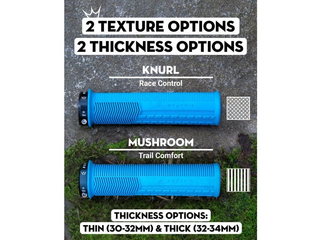 Textura Mushroom je zaměřená na celodenní komfort a příjemný kontakt s dlaní. Varianta Thin nabídne sportovnější pocit a přímější spojení s kolem, Thick přidá více tlumení a pohodlí při delších jízdách.